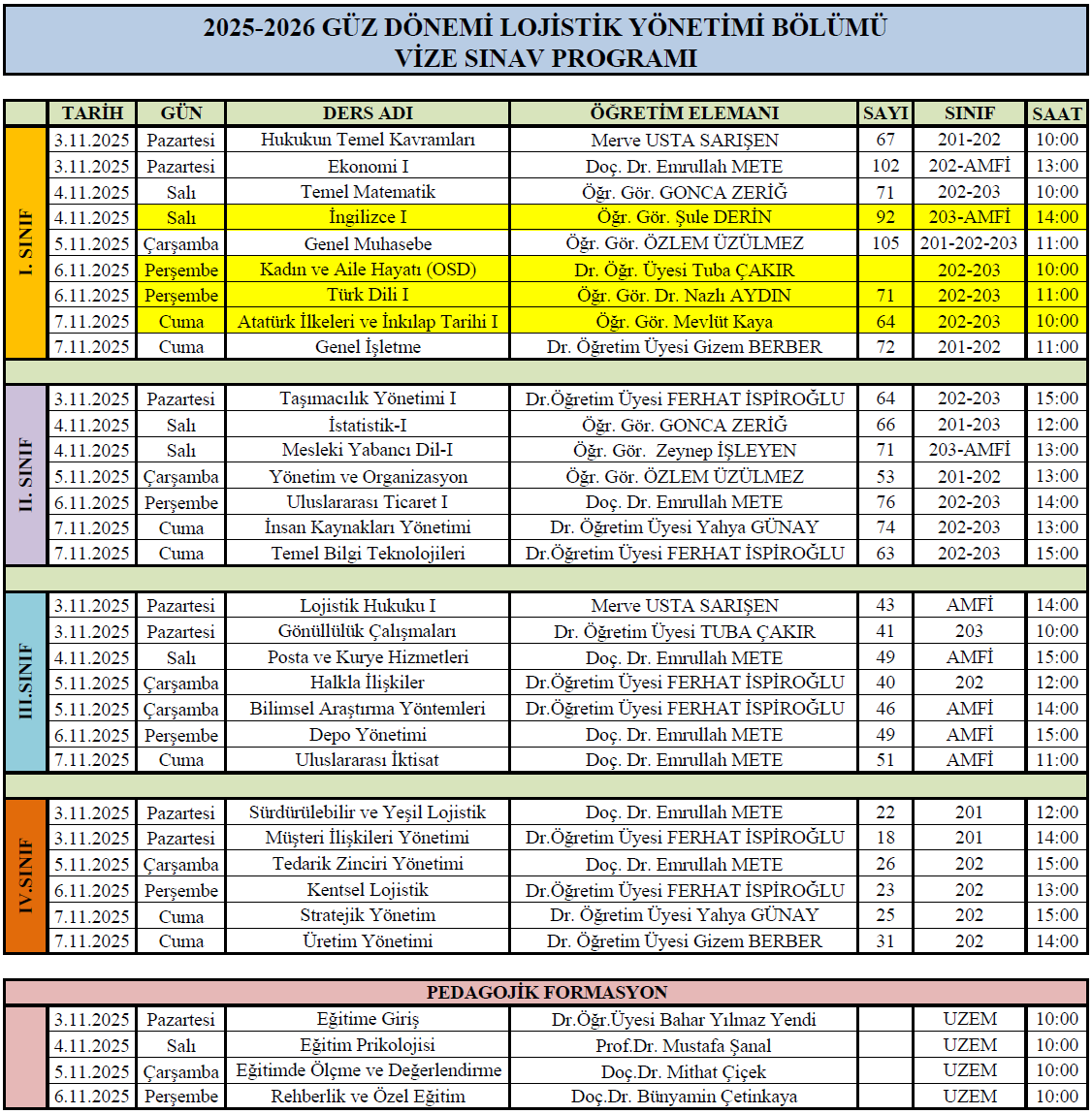 2025-2026 Güz Dönemi Vize Sınav Takvimi